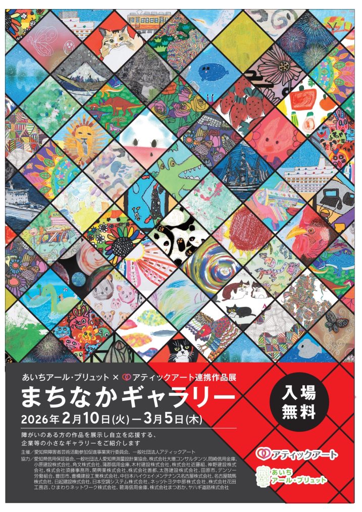 愛知県と一般社団法人アティックアートの連携事業として、障害のある方の作品を原画としてデザインした企業等のノベルティグッズを県内企業の社屋等で展示する「まちなかギャラリー」を開催します。