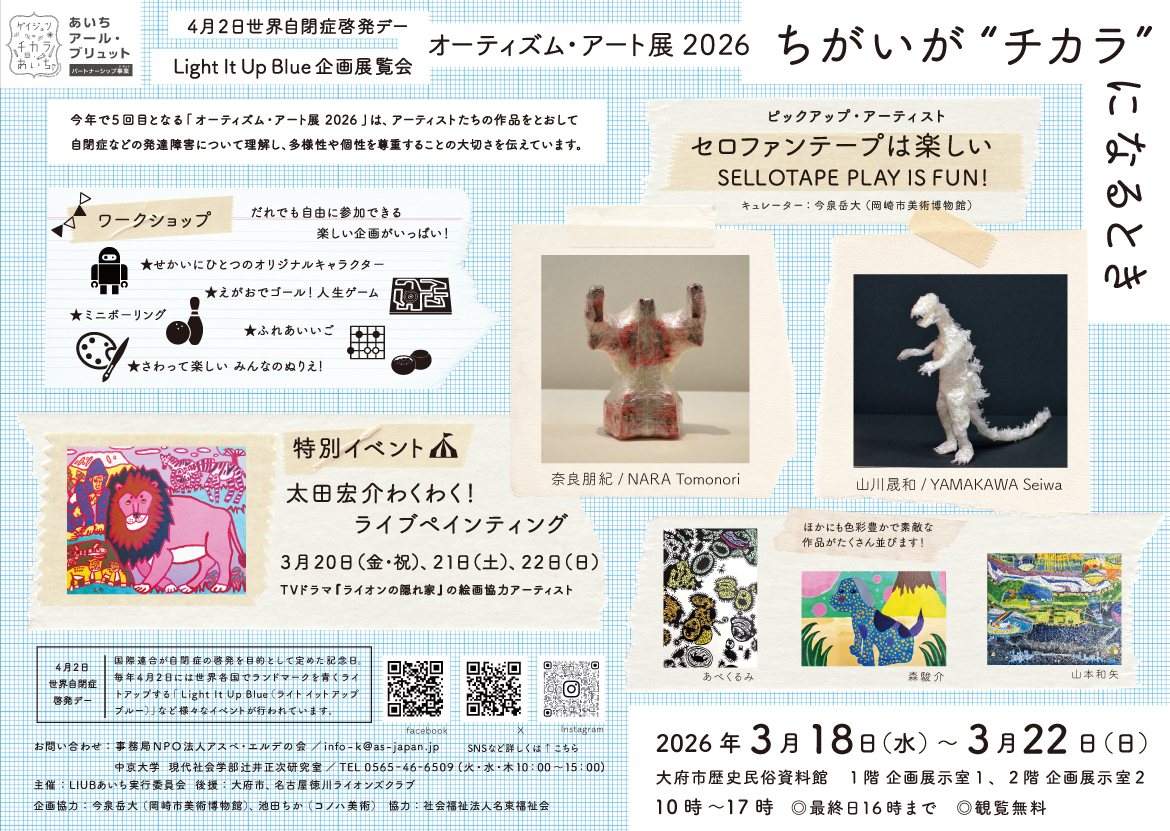 国連が定めた4月2日「世界自閉症啓発デー」に向けて開催される展覧会で、今年は2人の作家さんのセロファンテープを使った作品の展示とともに、障害のある方々の作品を多数紹介します。
