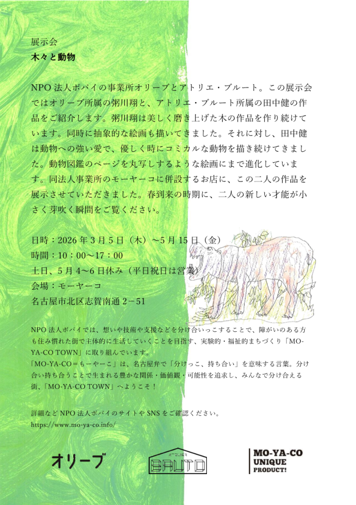NPO法人ポパイの事業所オリーブとアトリエ・ブルート。この展示会ではオリーブ所属の粥川翔と、アトリエ・ブルート所属の田中健の作品をご紹介します。粥川翔は美しく磨き上げた木の作品を作り続け、同時に抽象的な絵画も描いてきました。田中健は動物への強い愛で、優しく時にコミカルな動物を描き続けています。図鑑を丸写しするような絵画にまで進化しました。春到来の時期に、二人の才能が小さく芽吹く瞬間をご覧ください。