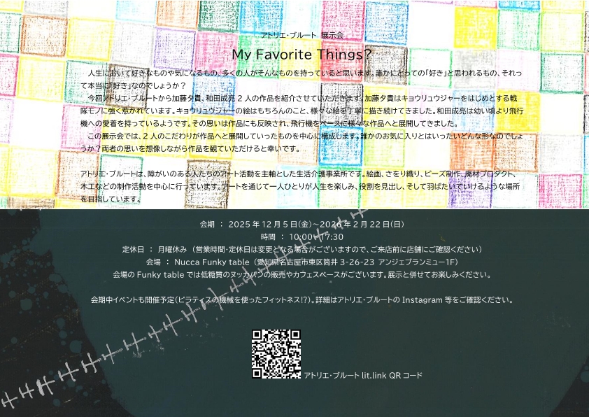 アトリエ・ブルートから加藤夕貴、和田成亮の作品を紹介させていただきます。加藤夕貴はキョウリュウジャーをはじめとする戦隊モノに強く惹かれています。キョウリュウジャーの絵はもちろん、様々な絵を丁寧に描き続けてきました。和田成亮は幼い頃より飛行機への愛着を持っているようです。その思いは作品にも反映され、様々な作品へと展開してきました。両者の思いを想像しながら作品を観ていただけると幸いです。